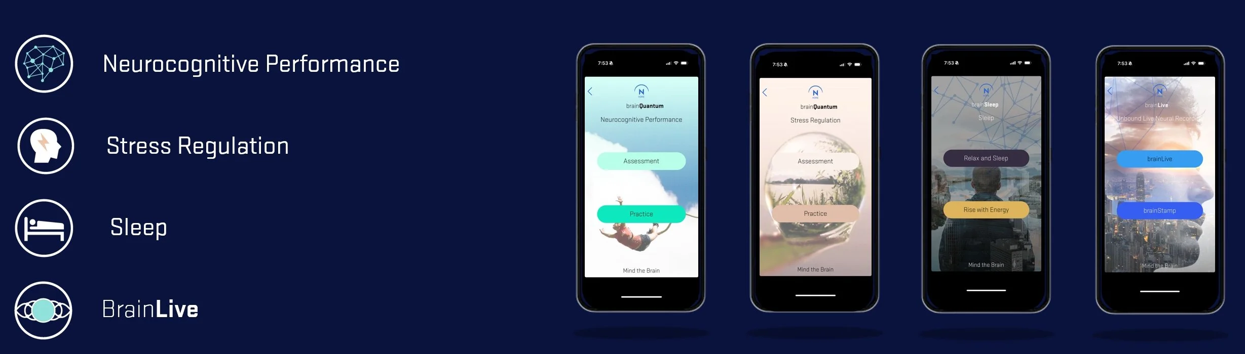 Unique sleep quality evaluation determined by six actionable sleep elements with precision assessment of brain performance and an A.I. recommender system to guide you into optimal results. Including a passive neurofeedback solution to improve sleep quality and curated experiences to relax and set your mind to sleep and to focus and energize you in the morning.